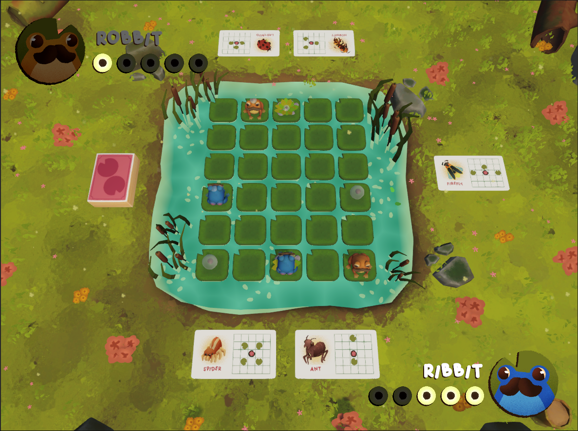 Kero Kata is an Onitama-inspired tactical game where frogs hop across a swamp to snatch eggs and race them back to their nest. Every move comes from a shared deck of cards, so it’s all about timing, risk, and outsmarting your opponent.